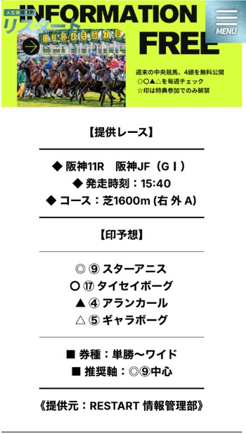 14日(日)に開催されたG1阪神JF 見事に三連単とワイドを完全的中させて 32万5000円を届けてくれたリスタート! ここ重賞無料予想強いですよね!